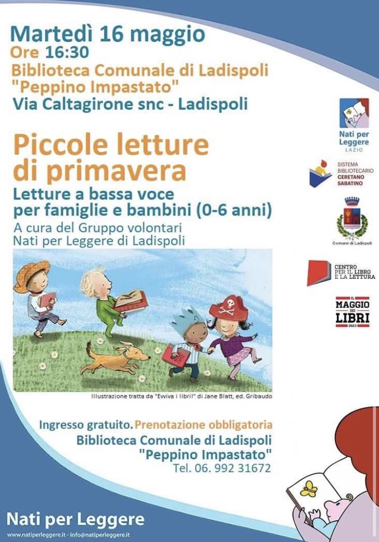 Ladispoli – Martedì 16 maggio alle 16:30 alla biblioteca “Peppino Impastato” di Ladispoli parte secondo appuntamento di “Piccole letture di primavera”, letture a bassa voce per bambini da 0 a 6 anni a cura del Gruppo Volontari Nati per Leggere di Ladispoli.
