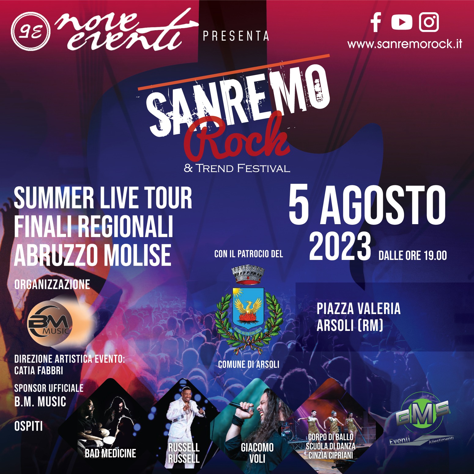 ARSOLI – In costante crescita l’attenzione per il noto Festival del Rock targato Sanremo che il 5 agosto 2023 approda ad Arsoli. Si tratta della tappa della Finale Multiregionale Abruzzo – Molise del Summer Live Tour del Festival di Sanremo Rock. La direzione artistica è affidata a Catia Fabbri, presidente della BM Music e parte del team di Sanremo Rock Festival