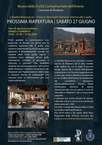 Valle Dell’Aniene – Anche la cultura riparte con la terza fase dell’emergenza. Sabato 27 giugno riapre al pubblico il della Museo della Civiltà Contadina Valle dell’Aniene. Gli ingressi, per ora, saranno limitati al sabato e alla domenica, negli orari 10-13 e 15-18. Le visite guidate saranno effettuate su prenotazione con preavviso di almeno tre giorni per le comitive superiori alle 5 unità, che saranno organizzate in piccoli gruppi per garantire il distanziamento sociale nel rispetto delle linee guida vigenti. I visitatori sono obbligati all’uso della mascherina. L’utilizzo di ascensori è riservato a persone con disabilità motoria con accompagnatori. All’interno della struttura i visitatori troveranno ambienti sanificati e potranno usufruire di dispenser per l’igienizzazione delle mani.