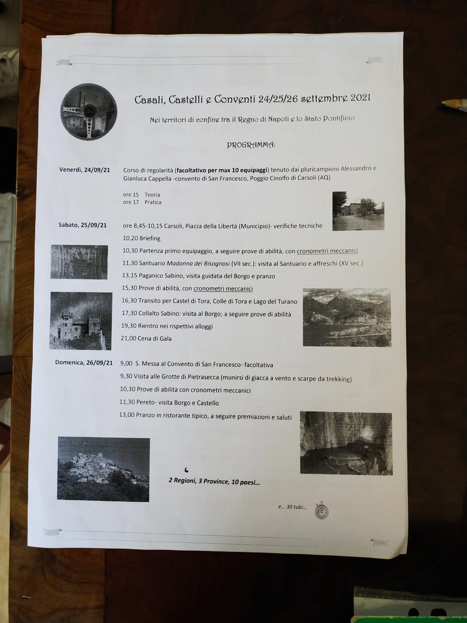 Già da Venerdì 24 si inizia con un corso facoltativo di regolarità che si svolgerà presso la suggestiva cornice del Convento di San Francesco, poi il giorno 25 appuntamento in piazza della Libertà a Carsoli dalle ore 8:45 inizieranno le verifiche tecniche, e la partenza ufficiale della quarta edizione, in un susseguirsi di eventi che scandiranno tutte e tre le giornate.