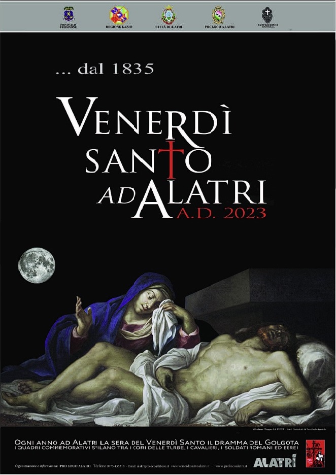 ALATRI – Dal 1835, ogni anno ad Alatri la sera del Venerdi Santo si svolge la più antica manifestazione religiosa della Città. . La sacra rappresentazione organizzata dalla Pro Loco vede protagonisti attori del popolo, senza registi né coordinatori, ed ogni anno è crescente il loro impegno ad arricchire la ricostruzione storica del dramma sul Golgota. La rievocazione consiste nella rappresentazione di quadri commemorativi che sfilano tra i cori delle turbe, i cavalieri, i soldati romani ed ebrei. Un numero rilevante di figuranti debitamente vestiti con la cura di ogni dettaglio risalente alle epoche passate. L’appuntamento con l’edizione 2023 è per venerdì 7 Aprile 2023 e tutto si preannuncia in grande stile.
