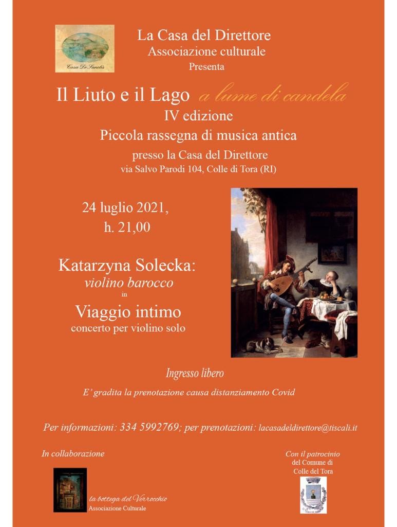 Colle di Tora – Scende la notte a Colle di Tora e l’atmosfera fiabesca, incantata che circonda La casa del Direttore ci fa già assaporare il prossimo concerto di musica barocca, che si terrà sabato 24 luglio alle 21. Quest’anno la Piccola rassegna di musica antica de “Il Liuto e Il Lago” – giunta ormai alla sua IV edizione – sarà a lume di candela. La luce fioca ci trasporterà nell’ intimo della musica, di una melodia raramente eseguita, che prende forma tra le ombre della sera. Sarà interpretata dalla musicista Katarzina Solecka al violino barocco.