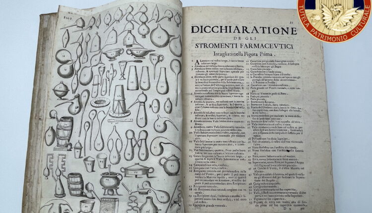 Un importante testo raro del 1682 “Universale Theatro Farmaceutico” dell’autore Antonio De Sgobbis, farmacista veneziano, è stato recuperato dal Nucleo Carabinieri Tutela Patrimonio Culturale di Monza. Il bene era stato sottratto nell’anno 1985 dal Nobile Collegio Chimico Farmaceutico di Roma e da allora se ne erano perse le tracce, fino alla sua recente comparsa nel mercato antiquario milanese dove risultava in vendita all’asta.