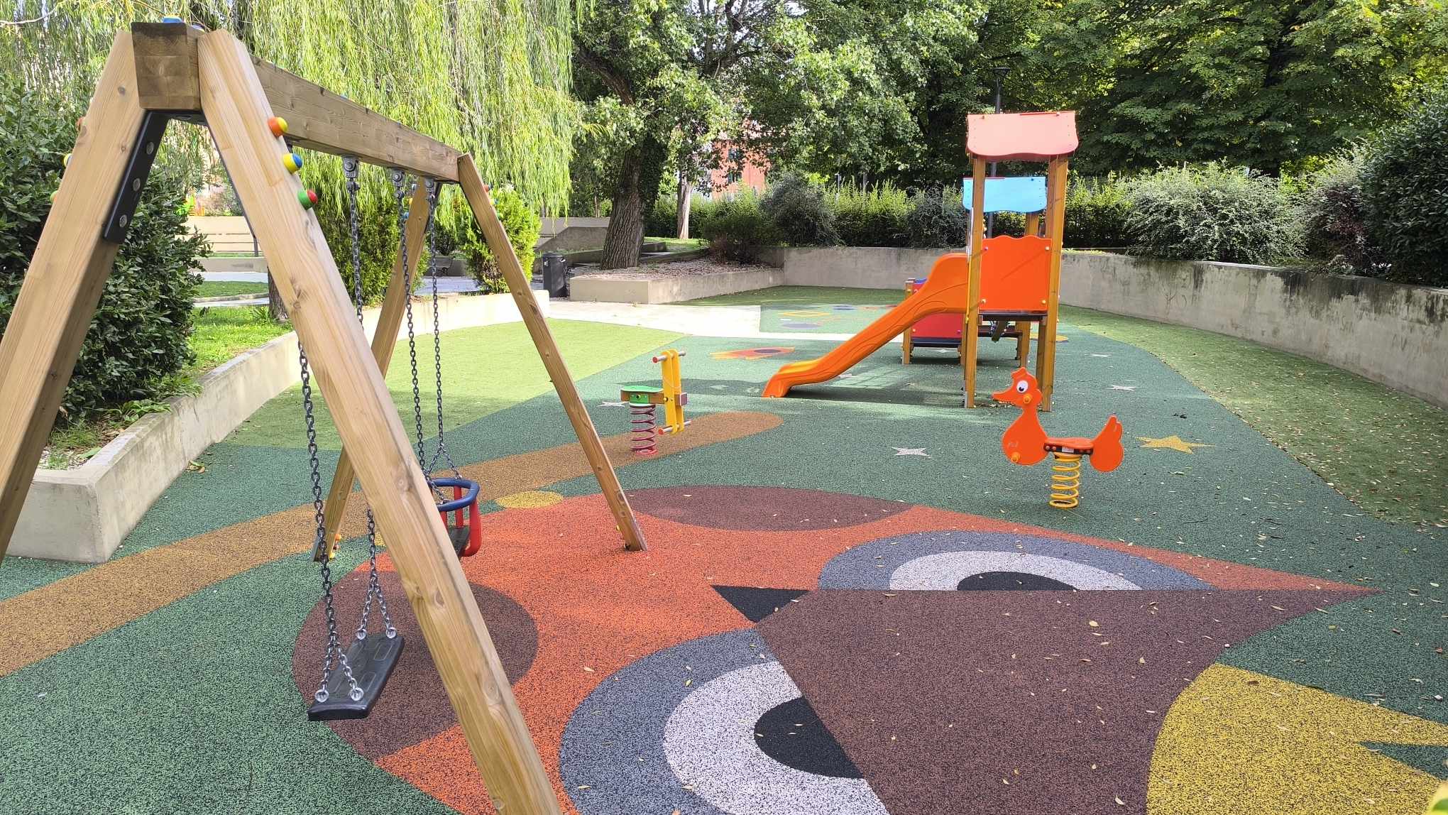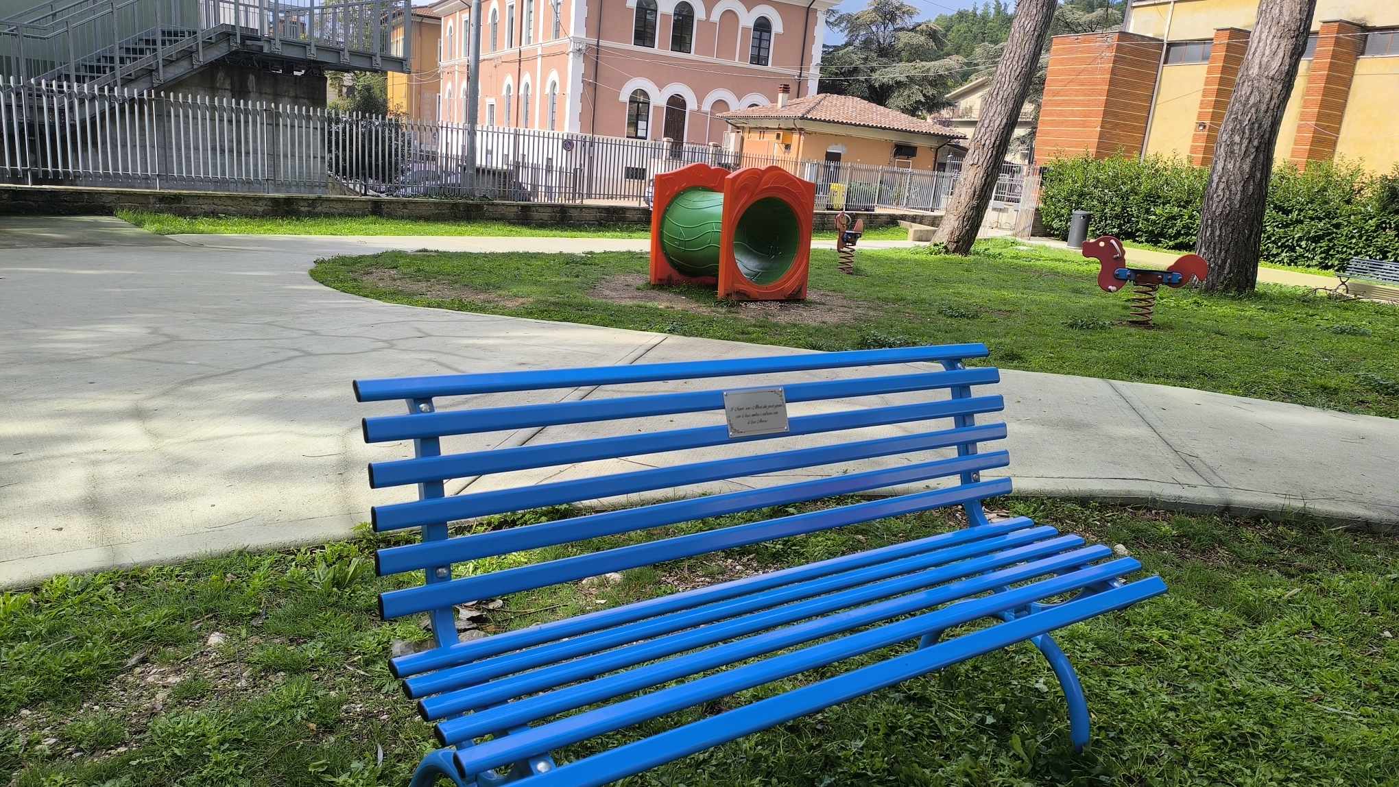 Una targa che riassume nel luogo dedicato allo svago dei più piccoli, un significato di rilevante importanza sul ruolo che i nonni rivestono nella società e nella vita quotidiana. La panchina è posizionata proprio in posizione dominante sull’area giochi.