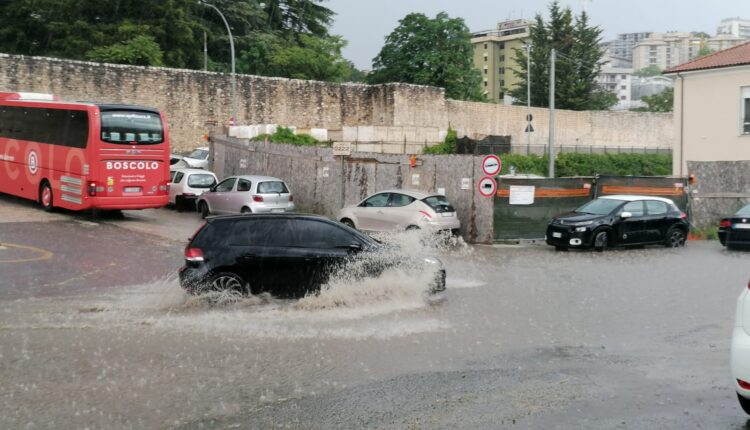 L’Aquila – Una violenta bomba d’acqua si è abbattuta nel pomeriggio su L’Aquila, provocando allagamenti in diverse zone della città. Tra le aree più colpite il piazzale antistante la stazione ferroviaria, completamente invaso dall’acqua.