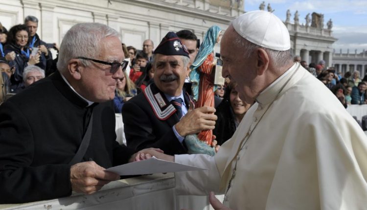Tagliacozzo. Momenti di fede ed emozione per la benedizione della statua della Virgo Fidelis impartita dal Sommo Pontefice Papa Francesco in un incontro con il parroco don Bruno Innocenzi. È stata una giornata memorabile per la Associazione nazionale carabinieri sezione di Tagliacozzo che rimarrà sicuramente nella storia del gruppo. Mercoledì 13, infatti, il presidente Filippo Di Mastropaolo ha preso parte alla tradizionale udienza del mercoledì a San Pietro con il preciso scopo di far benedire dal pontefice una statua della Madonna. Insieme al lui, oltre ad alcuni componenti della sua famiglia, il parroco di Tagliacozzo don Bruno Innocenzi che ha assistito con il brigadiere alla funzione.