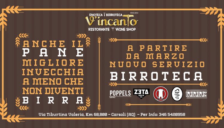 V’incanto Enoteca Carsoli rende noto che dal prossimo mese di Marzo 2020 si arricchisce la formula dei servizi “LA BIRROTECA” con più di 100 etichette di birre da tutto il mondo sia alla spina che in bottiglia; il locale quindi acquisirà una doppia faccia con la sala” La Cantinella” che si concentrerà come sempre sul vino e sulla ristorazione e la sala “Malto e Mosti” che si rifarà il “look” per questo nuovo ingresso e parlerà di birra.