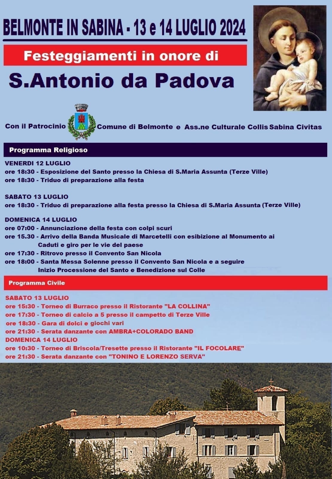 BELMONTE IN SABINA – A Belmonte in Sabina weekend di festeggiamenti in onore di Sant’Antonio di Padova. Predisposto programma civile e religioso, il dettaglio: