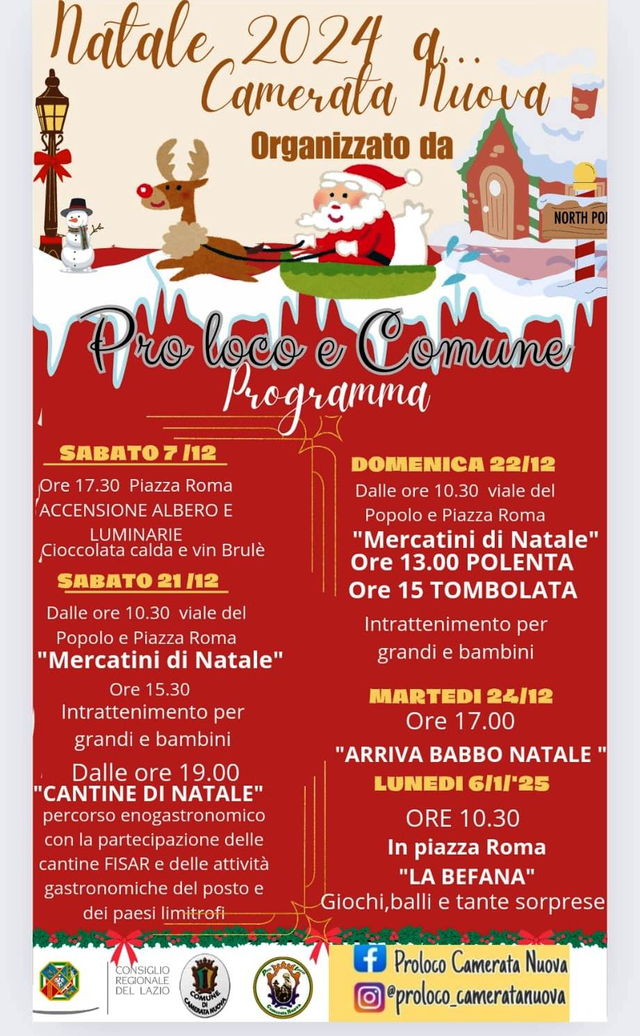 Le festività natalizie a Camerata Nuova prenderanno il via con una serie di appuntamenti che celebrano il fascino di questa stagione. L’illuminazione delle strade del borgo, con luci che richiamano la magia delle feste, farà da preludio a giornate dense di attività. Mercatini di Natale, spettacoli, musica dal vivo e intrattenimento per bambini saranno al centro della programmazione. Un mix perfetto per immergersi nell’atmosfera natalizia e riscoprire il piacere della condivisione.