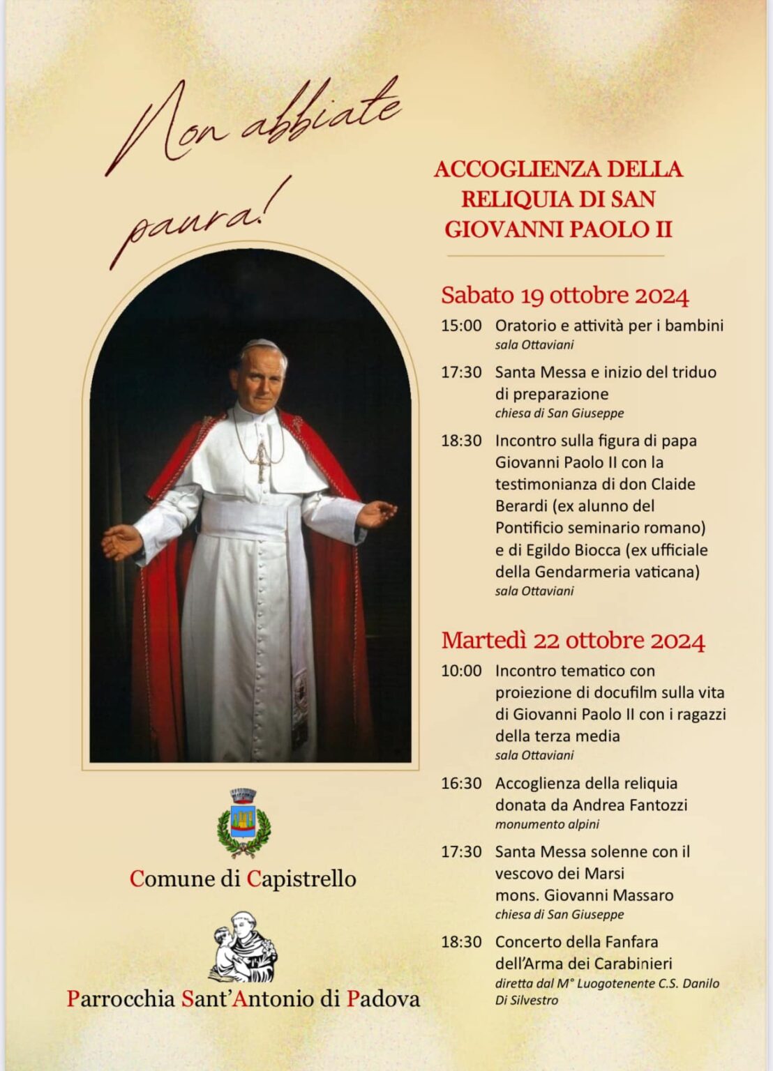 Capistrello. Martedì 22 ottobre, Capistrello accoglierà con gioia la reliquia di San Giovanni Paolo II, un evento molto atteso dai cittadini. Il Comune ha organizzato una serie di iniziative per celebrare l’occasione, a partire da sabato 19 ottobre, con momenti di preghiera, incontri e attività per tutte le età.