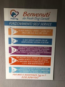 Nel lavaggio self-service di “Fresh Dog”, con un gettone della durata di 8 minuti si ha a disposizione un miscelatore di acqua calda e acqua fredda per il bagno e un phon ad aria calda per l’asciugatura. In dotazione sono compresi anche lo shampoo, prodotto garantito e specifico per cani, spazzole professionali e asciugamani usa e getta, per una pulizia e un’asciugatura completa ed efficace.