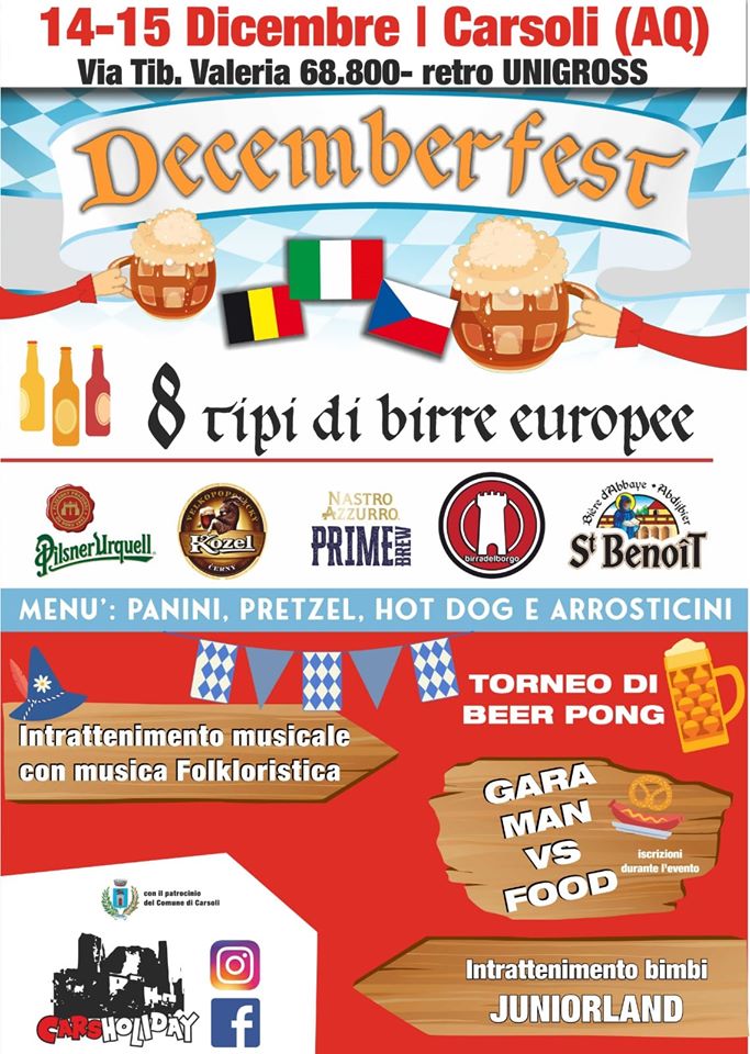 Carsoli – Al via a Carsoli la duegiorni organizzata dal comitato Carsholiday: il 14 e il 15 dicembre i ragazzi del comitato trasferiranno Monaco in via Tiburtina Valeria 68.800 (sul retro del negozio Unigross). Eventi in sequenza per divertimento e convivialità negli amplissimi spazi in una manifestazione organizzata in tutti i suoi dettagli.