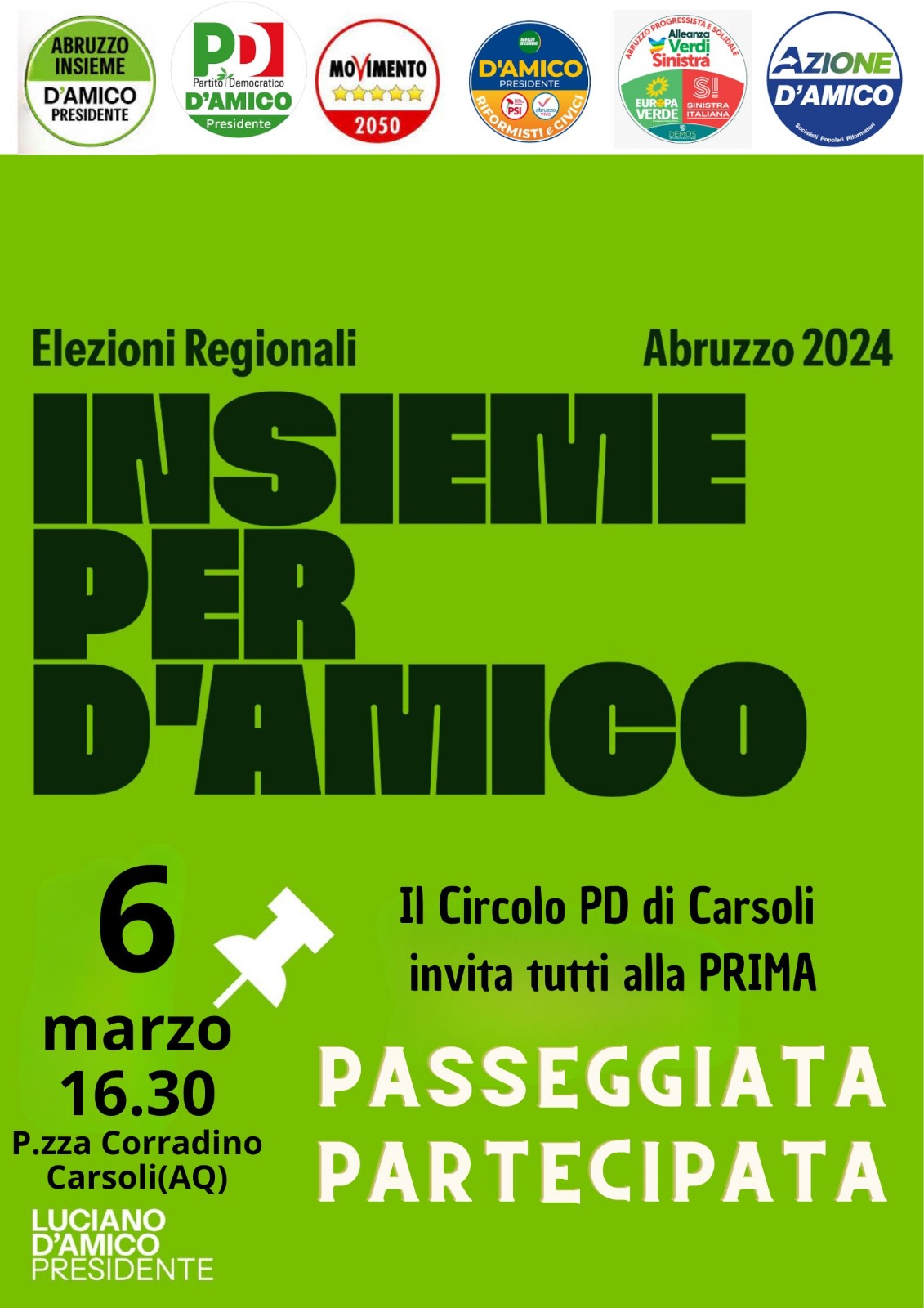 Carsoli – Proseguono le iniziative elettorali in vista del voto a Carsoli arriva il candidato presidente del centrosinistra il professore Luciano D’Amico in una passeggiata partecipata. Appuntamento mercoledì 6 marzo 2024 in piazza Corradino a Carsoli alle ore 16.30. L’iniziativa è stata intrapresa dalla coalizione di centrosinistra.