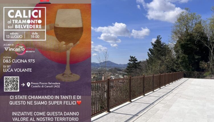 Carsoli – Per dare lustro al nuovo belvedere completamente ristrutturato e per farlo conoscere V’Incanto enoteca Carsoli ha organizzato un evento unico nel suo genere: Calici al Tramonto sul Belvedere! Save The date. Sabato 13 luglio 2024 dalle ore 18.00… in poi…
