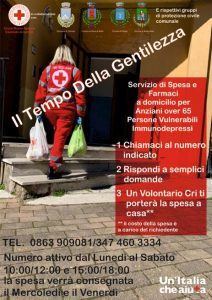 Con il “tempo della gentilezza” si provvede alla consegna di spesa e farmaci a domicilio per anziani over 65, persone vulnerabili e immunodepresse. Chiunque ne avesse bisogno può contattare i numeri 0863-909081 e 3474603334.