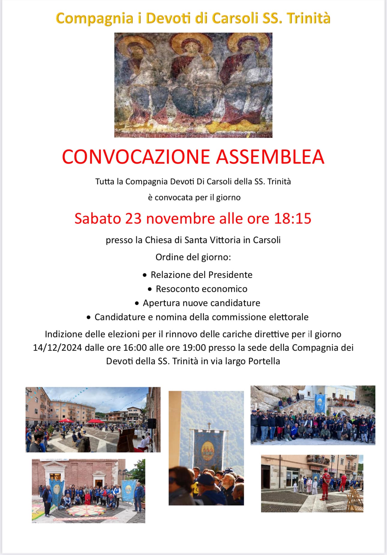 CARSOLI – E’ stata indetta dal presidente Mauro Iacuitti l’assemblea della compagnia dei devoti per Sabato 23 novembre 2024 alle ore 18,15 presso la sede di via Largo Portella. Di seguito il dettaglio dell’ordine del giorno tra cui le elezioni per il rinnovo delle cariche