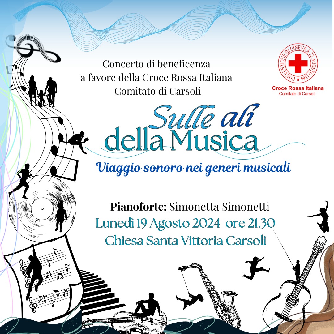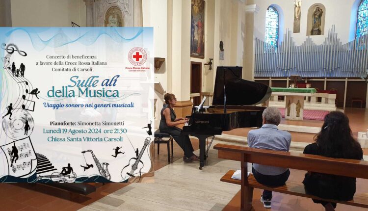 CARSOLI – Una interessante iniziativa è stata intrapresa con appuntamento Lunedì 19 Agosto 2024 alle ore 21.30 presso la Chiesa Parrocchiale di Santa Vittoria. Al pianoforte la prof.ssa Simonetta Simonetti protagonista di un viaggio sonoro che delizierà i presenti apprezzando vari generi musicali. L’evento è a scopo benefico in favore della Croce Rossa Italiana comitato di Carsoli. Di seguito il dettaglio evento: