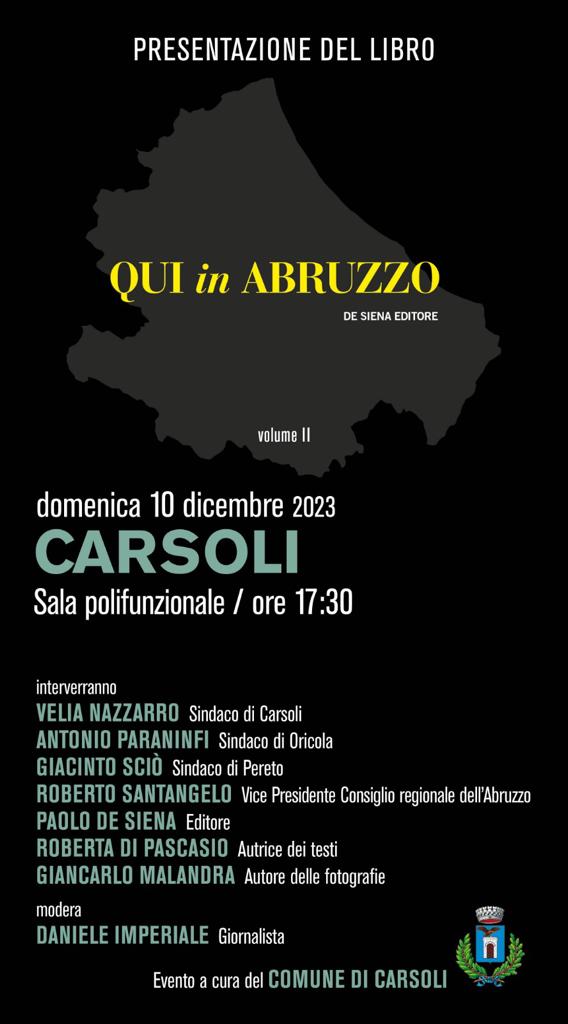 CARSOLI – Grande attesa per domenica 10 Dicembre 2023 alle ore 17,30 presso la Sala Polifunzionale di Via Aquila, per la presentazione del libro “Qui in Abruzzo”, De Siena Editore. “Un momento importante – spiega il sindaco Velia Nazzarro – per esplorare le bellezze, il mondo patrimonio della nostra Regione, con un’attenzione particolare al nostro paese e a tutta la Piana del Cavaliere”.