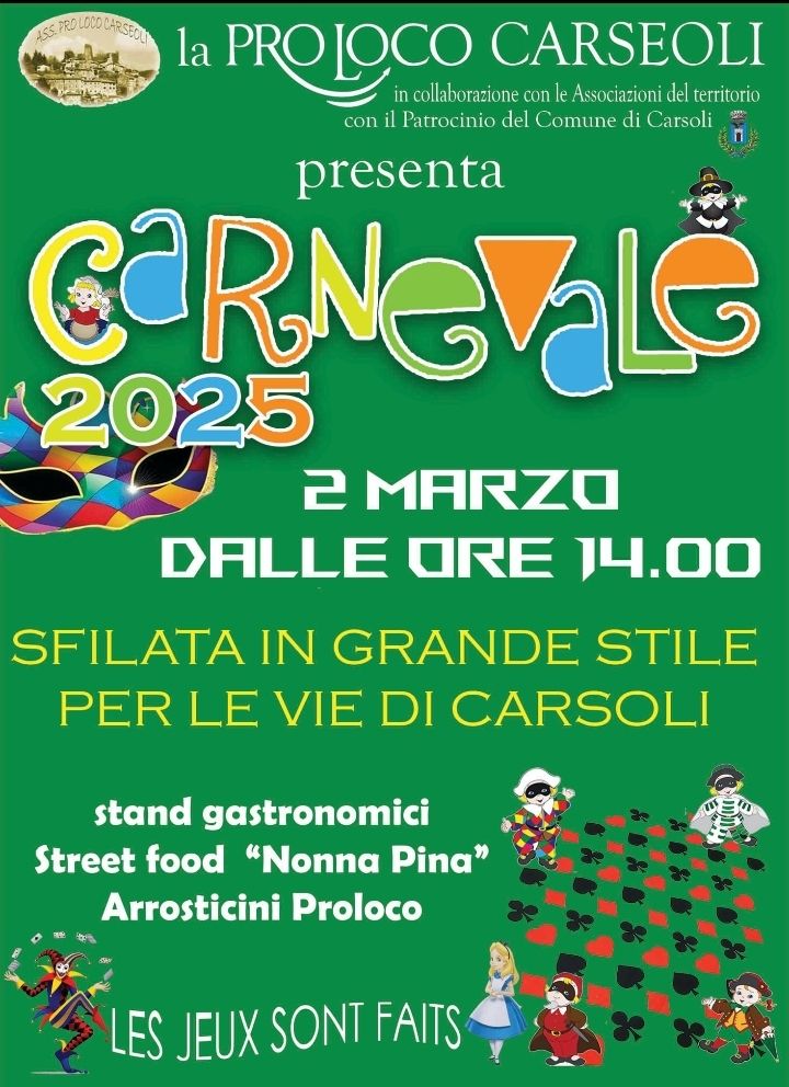 CARSOLI – L’appuntamento è per domenica 2 marzo 2025, quando la città si vestirà dei colori e delle emozioni del Carnevale. Un bel pomeriggio dunque da vivere insieme per una organizzazione messa a punto dalla Pro Loco Carseoli in collaborazione con le associazioni del territorio e con il patrocinio del comune di Carsoli. Di seguito il dettaglio evento in locandina.