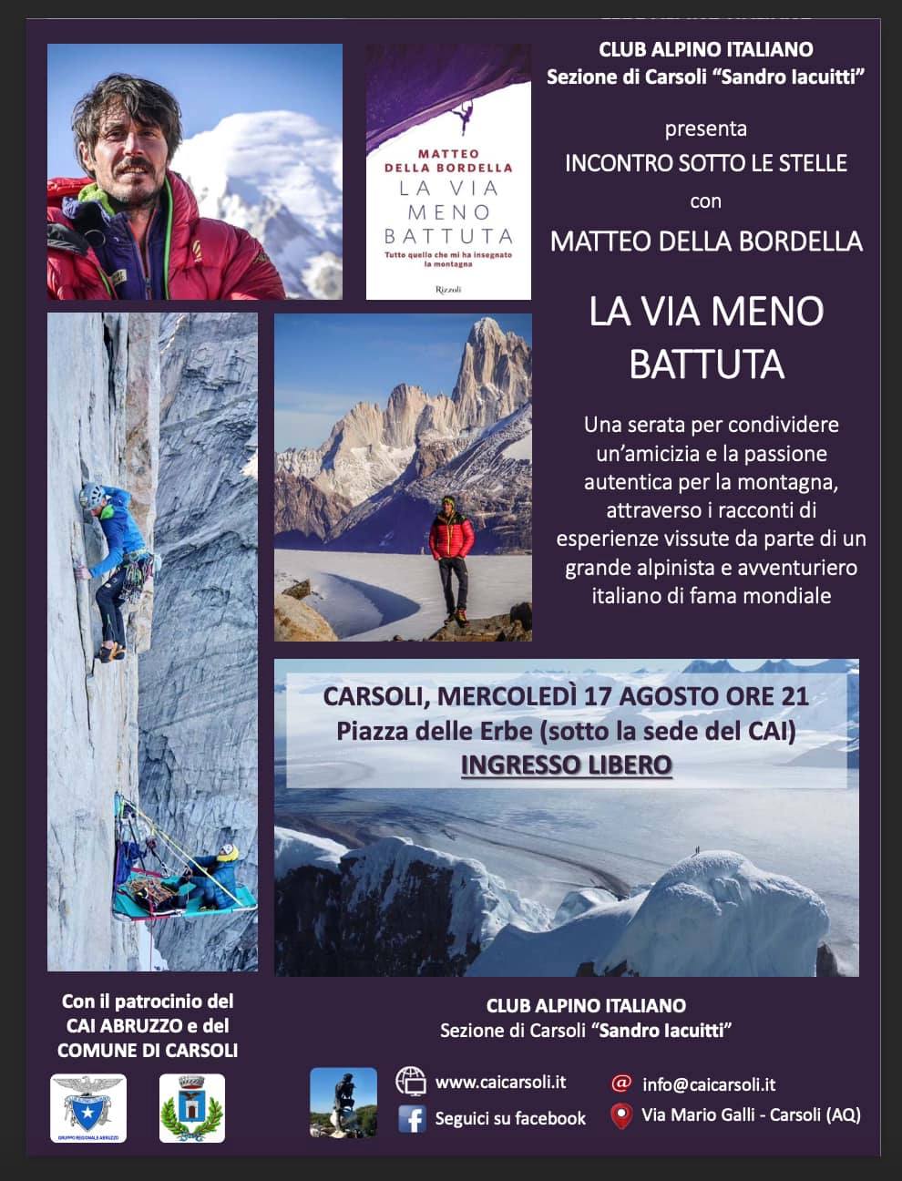CARSOLI – Il Cai sezione di Carsoli intitolata a Sandro Iacuitti ha organizzato per questa sera Mercoledì 17 Agosto 2022 “Incontro sotto le stelle”. Sarà presente il noto escursionista Matteo della Bordella già approdato a Carsoli per la duegiorni alla Falesia di Pietrasecca. Lo stesso è autore del libro “La via meno battuta – tutto quello che mi ha insegnato la montagna”.  E proprio da questi contenuti si trarranno spunti per vivere una serata che di fatto celebra la montagna.
