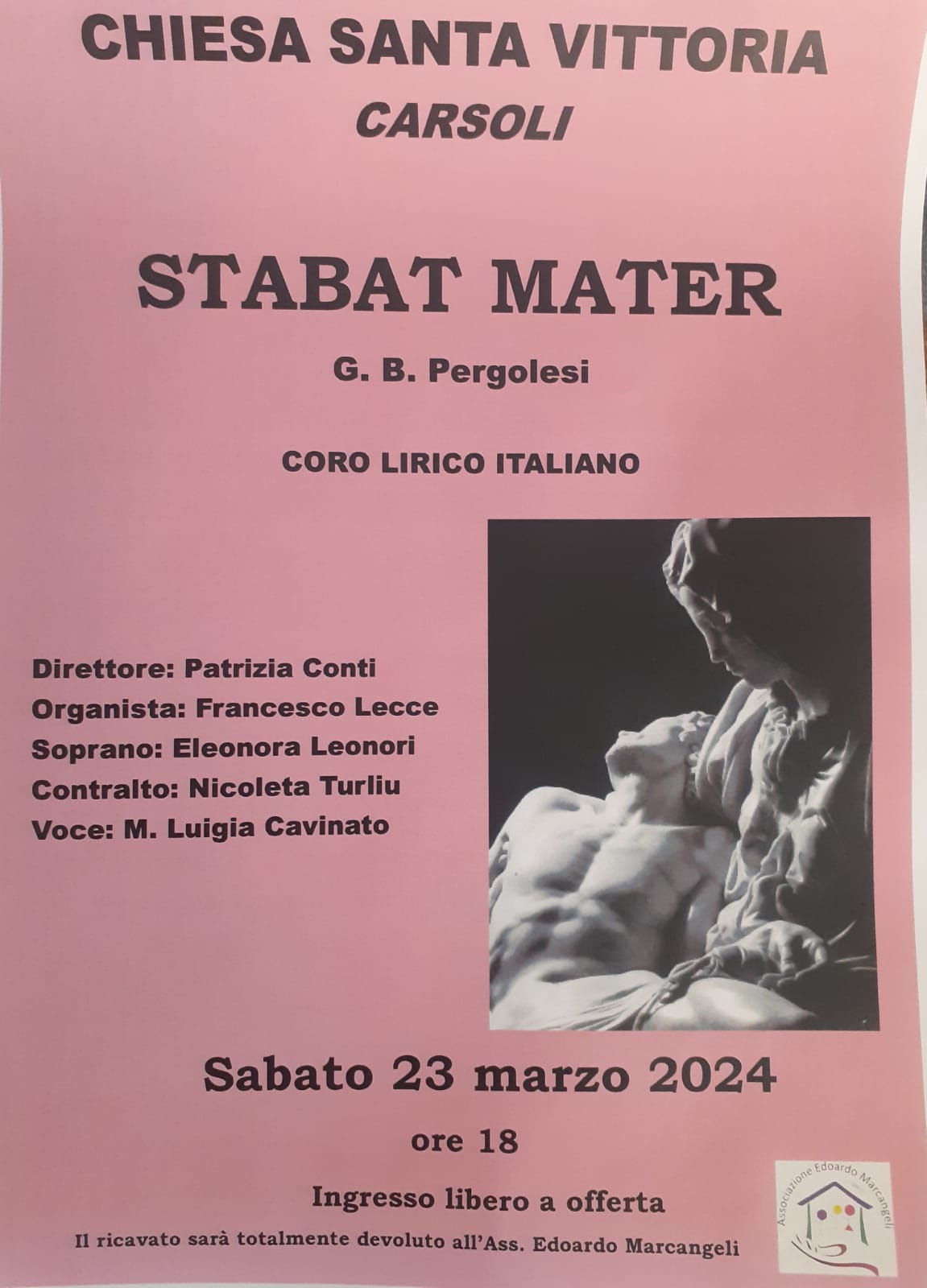 CARSOLI – L’appuntamento è presso la Chiesa Parrocchiale di Santa Vittoria in Carsoli. Sabato 23 Marzo 2024 alle ore 18.00 con lo Stabat Mater di Giovanni Battista Pergolesi. Il Coro Lirico Italiano si esibirà in un concerto solidale: il ricavato delle offerte sarà devoluto all’Associazione “Edoardo Marcangeli” di Carsoli. Di seguito ild ettaglio evento:
