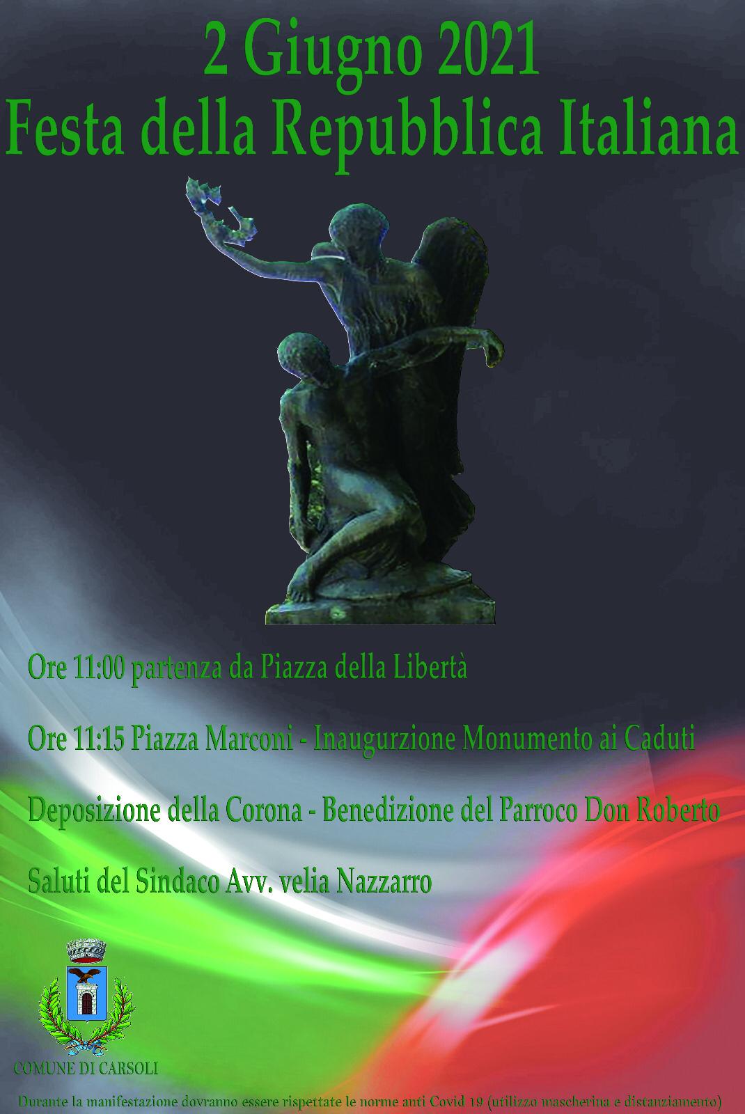 Carsoli – La nuova location del Monumento ai caduti sarà occasione per festeggiare il 2 Giugno dedicato alla costituzione della Repubblica Italiana. Alle ore 11 è prevista la formazione del corteo da Piazza della Libertà (seguendo ovviamente le normative di distanziamento sociale anticovid), per poi arrivare a piazza Guglielmo Marconi, ove si procederà ad inaugurare ufficialmente il monumento che si sposta dalla attuale collocazione dei giardini pubblici.
