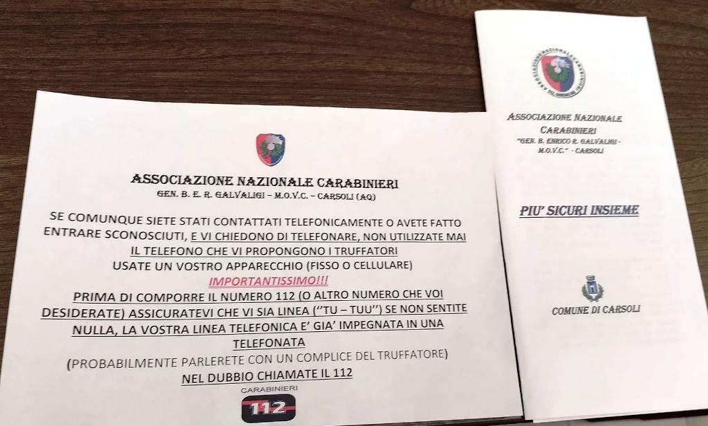 CARSOLI – Si è svolto nel pomeriggio di ieri un interessante incontro sul tema “Più sicuri insieme”, promosso dall’Associazione Nazionale Carabinieri in collaborazione con l’amministrazione comunale di Carsoli. All’iniziativa ha presenziaato un bel gruppo di cittadini che è stato reso edotto sui rischi di truffa e come evitare di incorrere in situazioni spiacevoli. Il sindaco Velia Nazzarro ha espresso soddisfazione e compiacimento per l’attuazione del progetto ringraziando sia la locale AnC che il comando di Carsoli per il loro impegno in favore della collettività.
