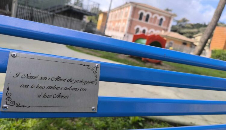 Una targa che riassume nel luogo dedicato allo svago dei più piccoli, un significato di rilevante importanza sul ruolo che i nonni rivestono nella società e nella vita quotidiana. La panchina è posizionata proprio in posizione dominante sull’area giochi.