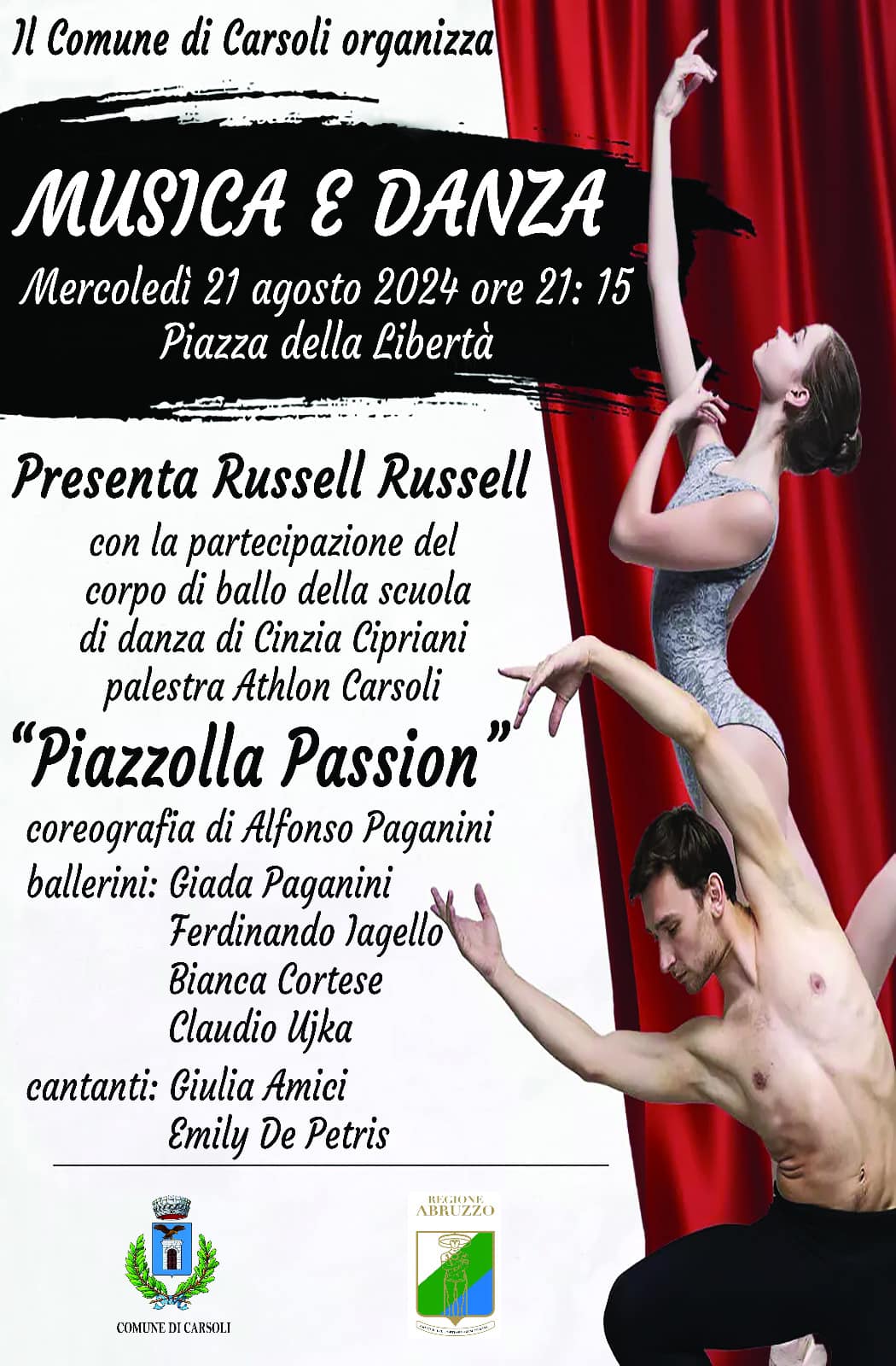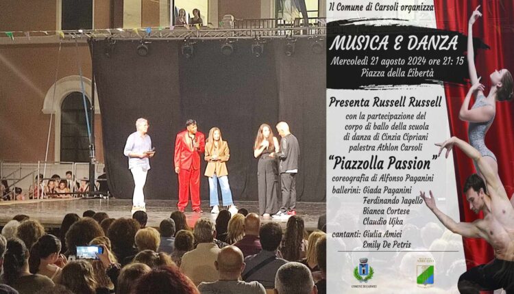 CARSOLI – Appuntamento questa sera dalle ore 21.15 in piazza della Libertà a Carsoli per  l’evento “Musica e Danza” organizzato dall’amministrazione comunale. Palco già pronto per accogliere il corpo di ballo della scuola di danza di Cinzia Cipriani della palestra Athlon di Carsoli che daranno vita ad uno spettacolo con la verve del brillante scenografo Russell Russel che condurrà la serata. Poi spazio alle stupende voci delle cantanti Giulia Amici e Emily De Petris che celebreranno la musica unitamente al “Piazzolla Passion” con la coreografia di Alfonso Paganini. L’evento è patrocinato dalla Regione Abruzzo.