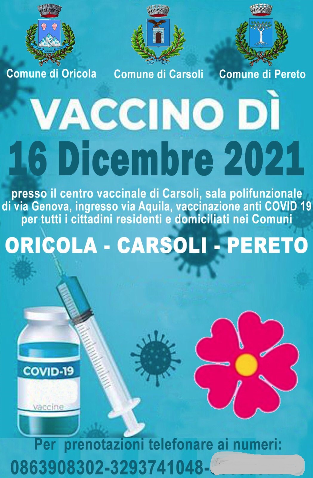 Carsoli – Un nuovo tour vaccinale è stato organizzato a Carsoli presso il centro vaccinale di Via genova. L’appuntamento è per Giovedì 16 dicembre 2021 durante l’intera giornata, il servizio è rivolto sia ai residenti che ai domiciliati nei tre comuni della piana del Cavaliere: Oricola, Carsoli e Pereto.
