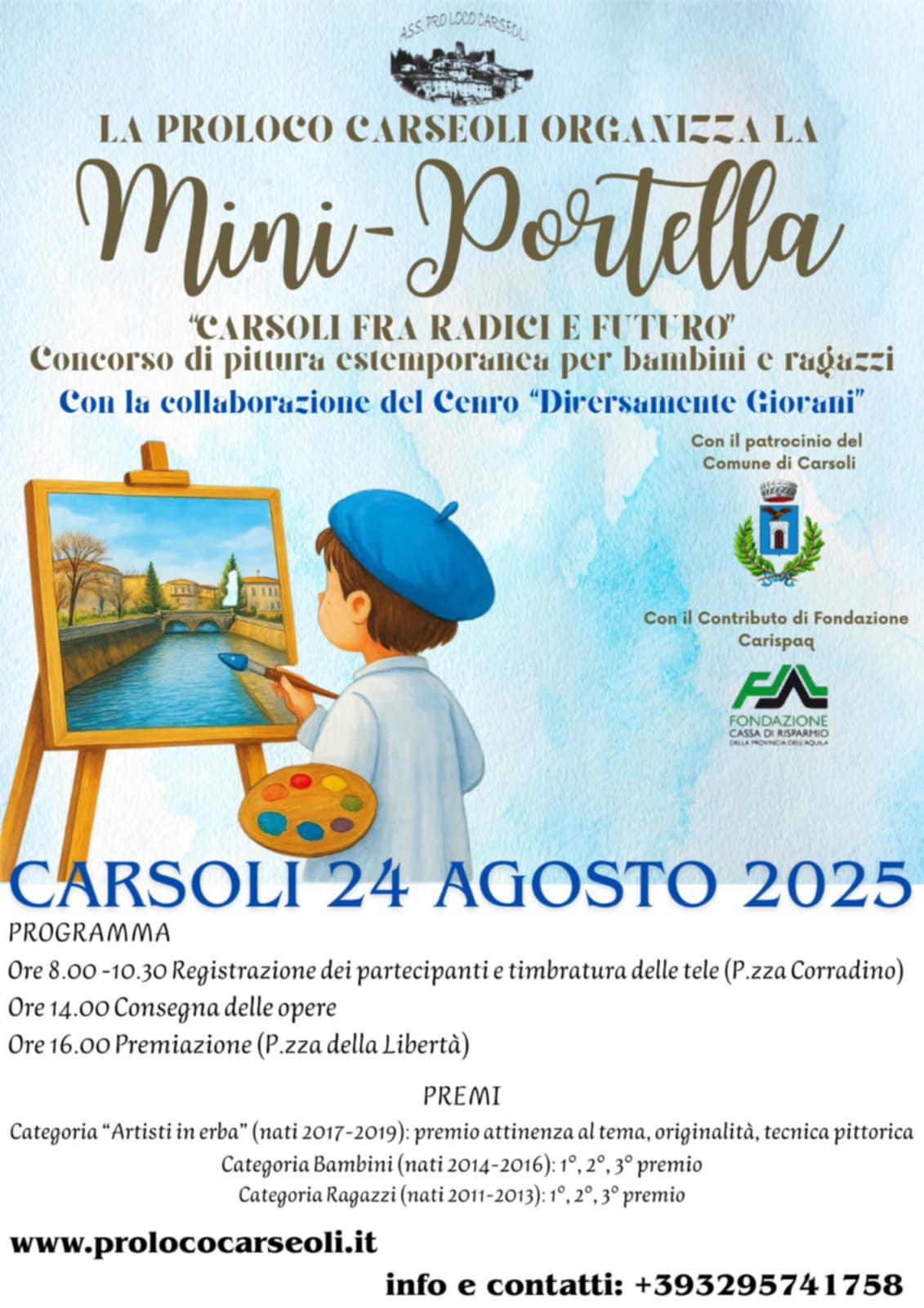 CARSOLI – La Pro Loco di Carsoli ha annunciato l’organizzazione della “Mini-Portella”, un concorso di pittura estemporanea dedicato a bambini e ragazzi che si svolgerà domenica 24 agosto 2025 in Piazza della Libertà. L’iniziativa, realizzata con la collaborazione del centro “Diversamente Giovani”, gode del patrocinio del Comune di Carsoli e del contributo della Fondazione Carispaq.