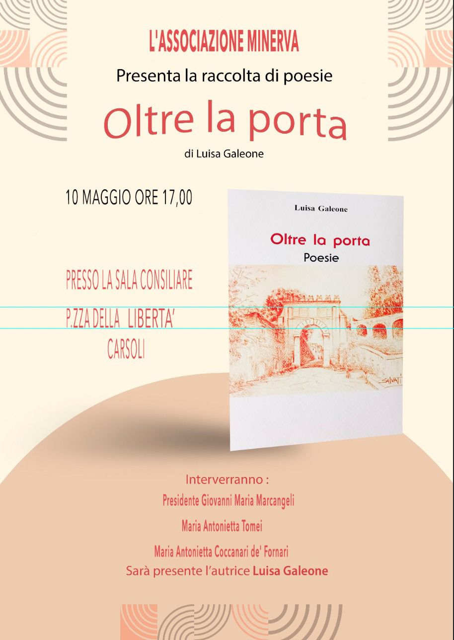 CARSOLI – Sarà presentata a Carsoli presso la sala consiliare la raccolta di poesie “Oltre la porta” di cui è autrice Luisa Galeone. Molte di queste poesie sono dedicate alla città di Tivoli ove vive da molto tempo. La Galeone è incaricata dal sindaco Marco Innocenzi per la poesia e la letteratura. La prefazione dell’opera è curata dall’ex sindaco di Tivoli Giuseppe Proietti. L’appuntamento è per il 10 maggio 2025 alle ore 17.00 presso la sala consiliare del comune di Carsoli. L’evento è organizzato dall’Associazione Minerva di cui è presidente l’Avv. Giovanni Alberto Marcangeli, che introdurrà l’incontro. A discutere con l’autrice su tematiche poetiche la tiburtina Maria Antonietta Tomei, curatrice del Museo di Tivoli.