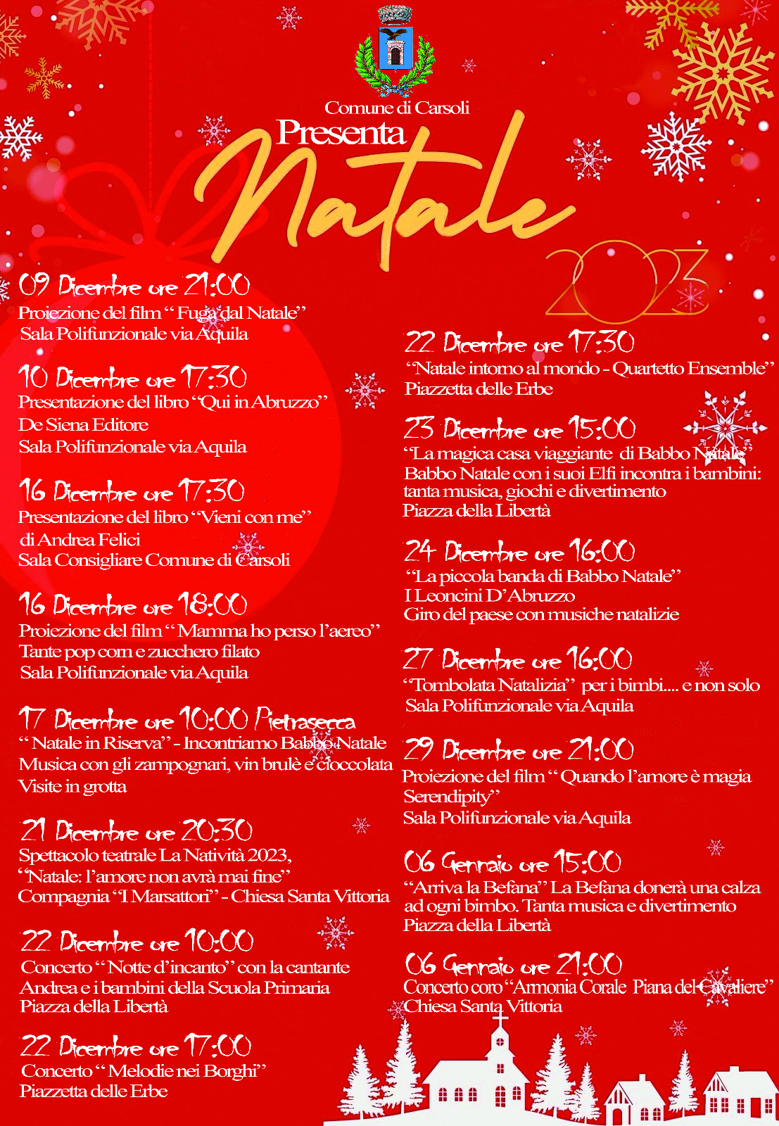 Carsoli – Vigilia con i Leoncini d’Abruzzo, la natività in Chiesa del 21 dicembre, poi il concerto del 22 con Ilenia Lucci in piazza delle erbe, ed oggi pomeriggio appuntamento alle 16 presso la Sala Polifunzionale di via Genova per una bella tombolata popolare organizzata dal comune, comune un tempo. Ma non finisce qui, di seguito la locandina con tutti gli eventi ancora in programma: