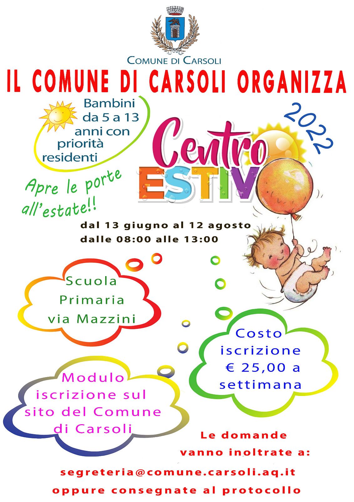 CARSOLI – Dopo le pause forzate causa covid riprendo le attività ludiche nel territorio di Carsoli, l’amministrazione comunale ha organizzato l’edizione 2022 del centro estivo. Una offerta di socializzazione rivolta ai bambini e ragazzi da 5 a 13 anni di età. Si parte dal 13 giugno e fino al 12 agosto 2022.