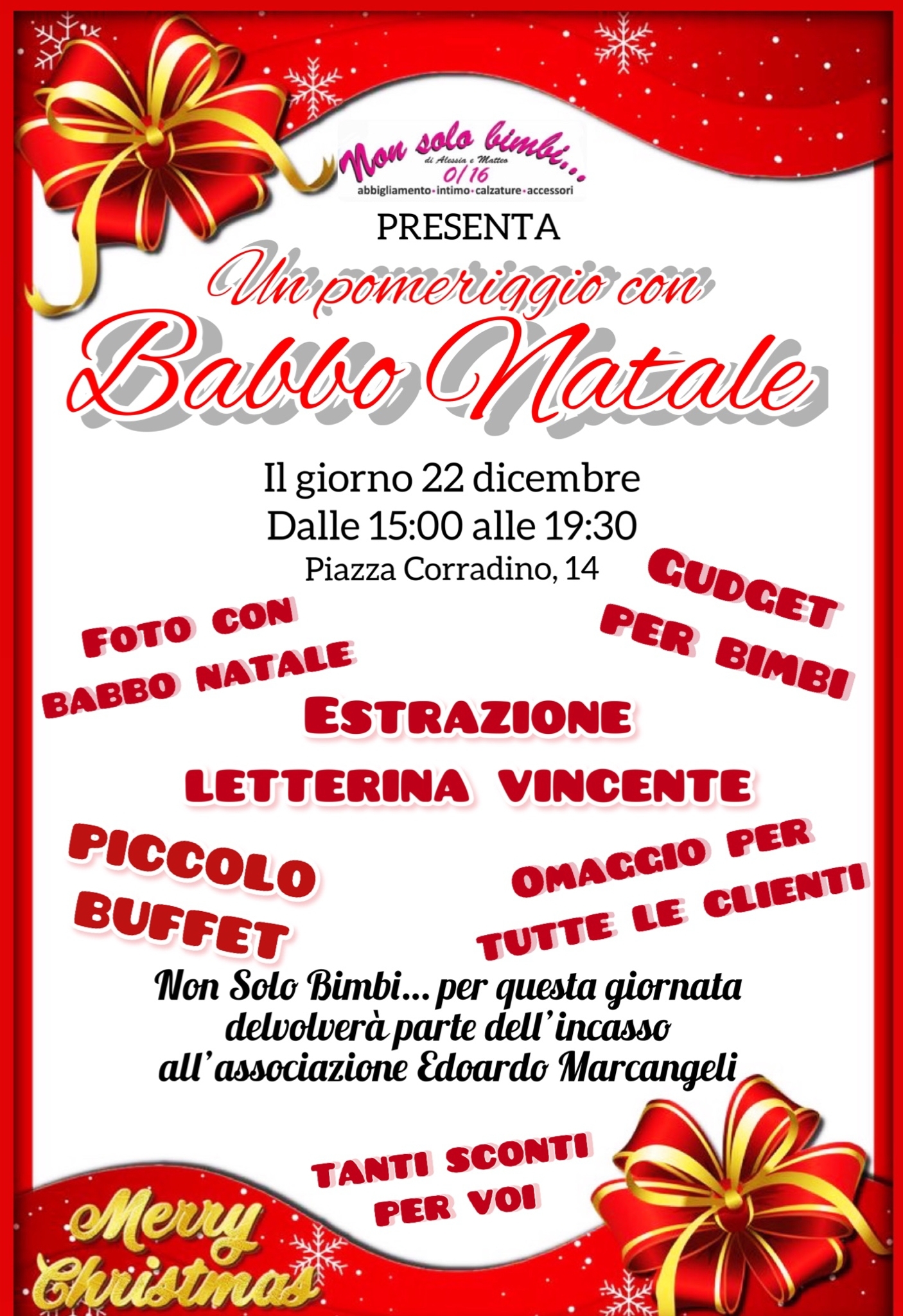 CARSOLI – L’appuntamento per un  pomeriggio con Babbo Natale è per domani giovedì 22 dicembre 2022  dalle ore 15 e fino alle 19.30. in piazza Corradino.  L’evento è organizzato da “Non solo bimbi”, di Alessia e Matteo. In questa festa ci sarà spazio per gadget natalizi per bambini, letterina vincente, e poi tanto divertimento e tante opportunità da cogliere proprio per colorare i giorni delle feste con tante proposte. E poi tanti sconti…