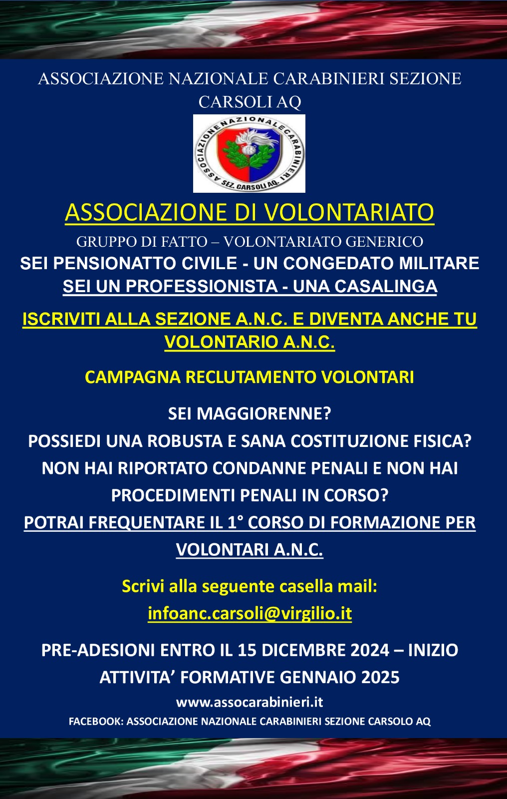 CARSOLI – Importante opportunità arriva dall’Associazione Nazionale Carabinieri intitolata al Gen. Galvaligi di Carsoli. L’attivissima sezione di cui è presidente Domenico Gregori, apre gli orizzonti di un volontariato caratterizzato da azione sociale, solidarietà ma soprattutto da professionalità per il supporto ad una molteplicità di iniziative fortemente caratterizzanti per il territorio.