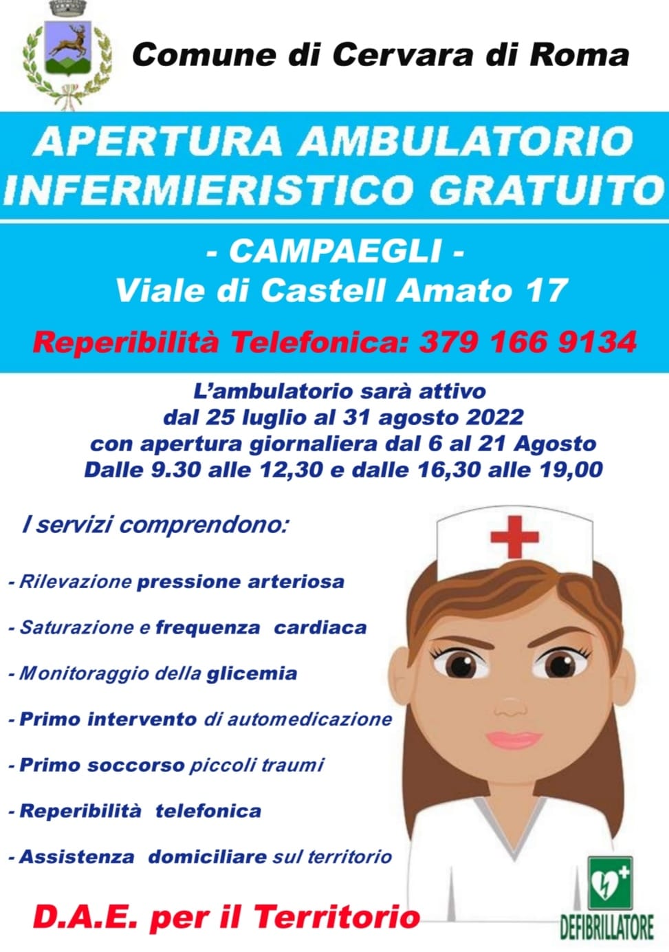 CERVARA DI ROMA – L’amministrazione comunale di Cervara di Roma in occasione del periodo estivo ha avviato una interessante iniziativa di alto spessore sociale. E’ stato aperto un ambulatorio infermieristico gratuito. Di seguito le specifiche dell’iniziativa: