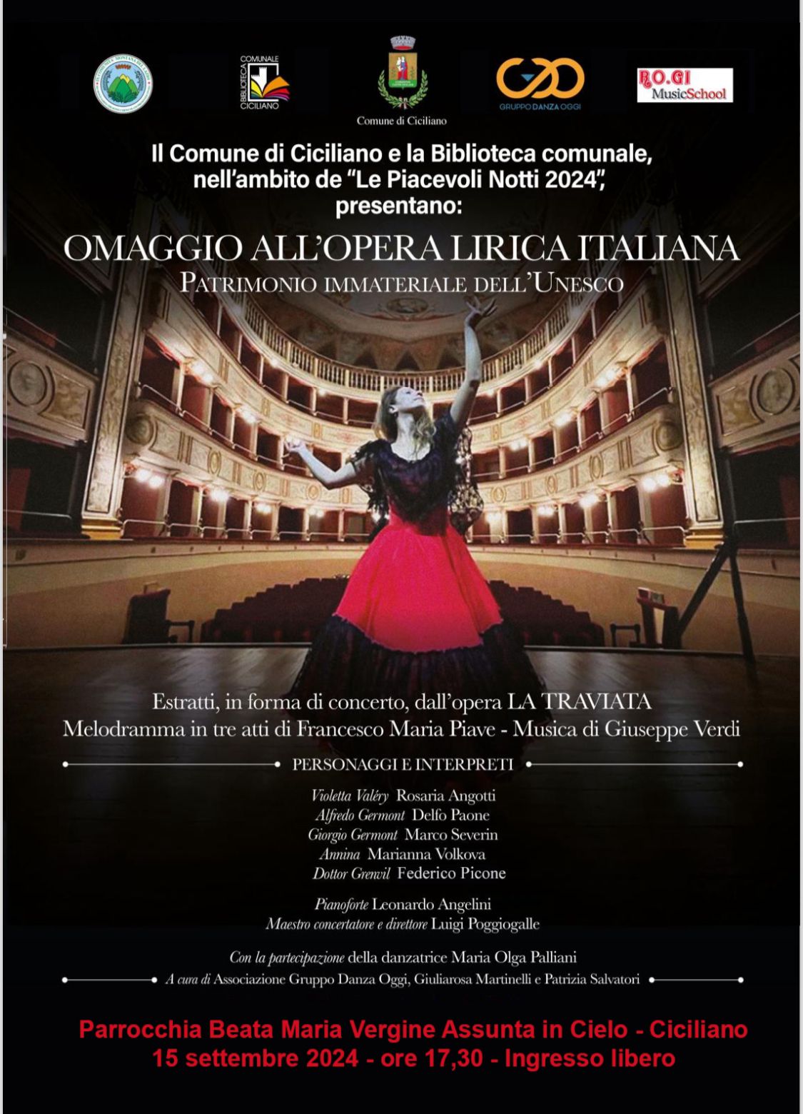 CICILIANO – Quale omaggio all’opera lirica italiana, Patrimonio immateriale dell’Unesco, il Comune di Ciciliano e la Biblioteca comunale, nell’ambito de “Le piacevoli notti 2024” presentano una serata dedicata all’opera con l’esecuzione di estratti in forma di concerto de “La Traviata”, melodramma in tre atti di Francesco Maria Piave, musica di Giuseppe Verdi.