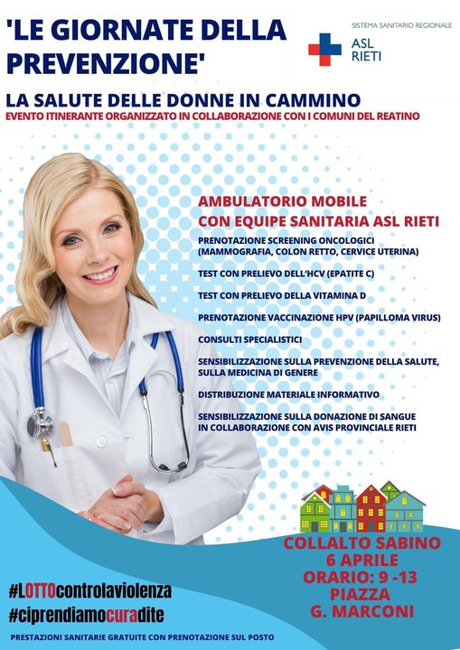 COLLALTO SABINO – La salute delle donne in cammino, appuntamento domani gioved’ 6 Aprile 2023 in piazza Marconi a Collalto Sabino: protagonista sarà la prevenzione con l’arrivo di un ambulatorio mobile itinerante che assicurerà consulenza e dove potranno essere svolte una serie di importanti attività per la propria salute. Di seguito il dettaglio evento: