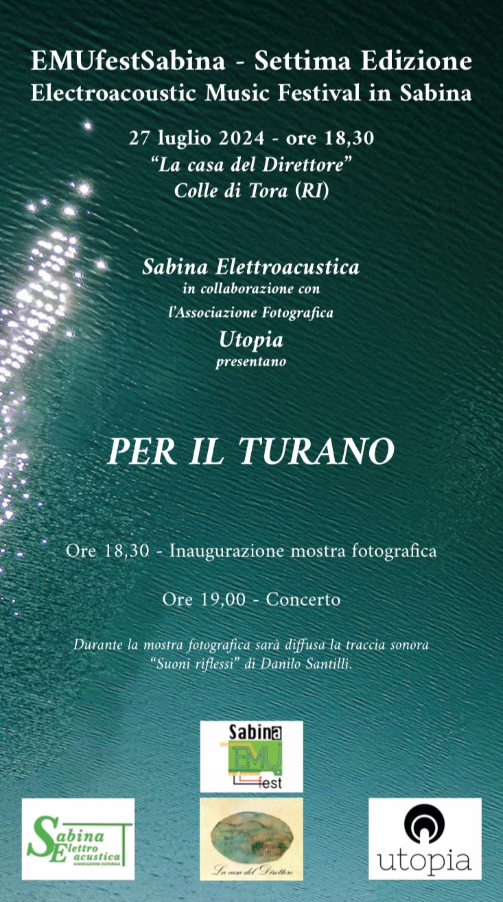 COLLE DI TORA – C’è grande attesa per un particolare  evento che si terra’ Sabato 27 Luglio alle ore 18:30,  presso la Casa del Direttore -a Colle di Tora in via Parodi104- la mostra concerto ” Per il Turano ” Con la mostra fotografica realizzata da Utopia-Aps ed il concerto ” Improvviso per il Turano” di e con il M.Giorgio Nottoli ; in prima assoluta , le incantevoli acque azzurre del lago ed il fascino dei suoi paesaggi diventeranno immagini poetiche e suoni suggestivi . Durante uno dei quadri sonori la Ensemble Sabina Elettroacustica eseguira’ suggestivi brani.