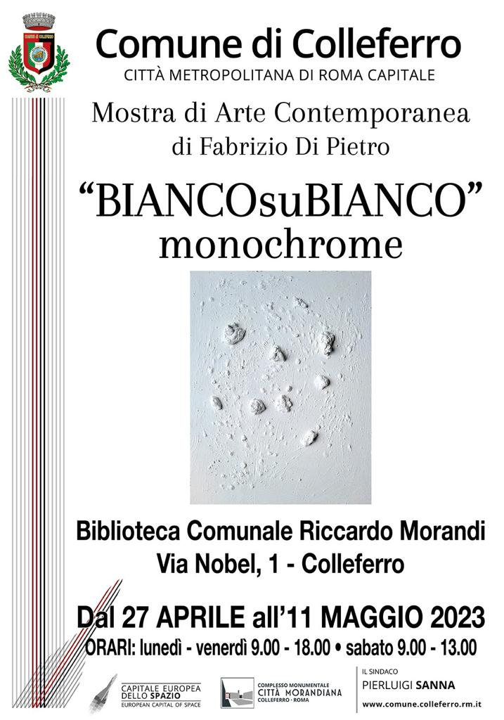 Colleferro – Giovedì 27 aprile alle ore 17.00, presso la Biblioteca Comunale di Colleferro “Riccardo Morandi”, sarà inaugurata la mostra di Fabrizio di Pietro “BIANCOsuBIANCO Monochrome”.