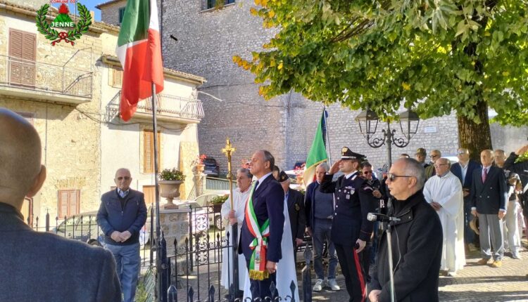 JENNE – Si è svolta ieri in una assolata mattina di novembre la suggestiva e partecipata cerimonia di commemorazione della festa dell’unità nazionale e delle Forze Armate. Il corteo al quale hanno partecipato moltissimi cittadini, autorità civili e militari, rappresentanti le istituzioni, gruppi locali ed associazioni, nonchè sulle note della Banda “Filiberto Massimi di Jenne, è arrivato, dopo la Messa celebrata dal parroco don Pietro, presso il monumento dei giardini pubblici dove in sequenza si è svolta la cerimonia. Prima l’alzabandiera, poi emozioni forti per la lettura scandita dei nomi di tutti i caduti jennesi pronunciati sommessamente dal vice sindaco Cristiano Lauri. Per ciascuno di loro il saluto ed il tributo con un colpo di grancassa. L’agente di Polizia Stefano Fratticci ha dato lettura della preghiera del combattente, poi il sindaco ha dato lettura del bollettino della vittoria e poi il discorso di rito.