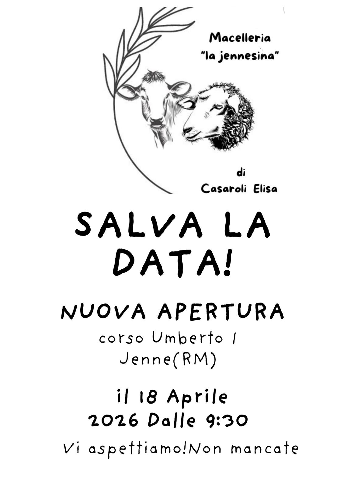 JENNE -. Una nuova attività commerciale si prepara ad animare il cuore di Jenne, borgo perla della valle Aniene. Domani sabato 18 aprile 2026, a partire dalle ore 9:30, verrà inaugurata la macelleria “La Jennesina”, situata in corso Umberto I, punto centrale del paese.