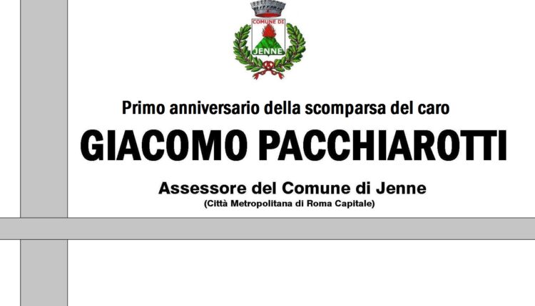 Jenne – Ricorre il primo anniversario della triste scomparsa del caro Giacomo Pacchiarotti, assessore comunale di Jenne che venne a mancare il 22 luglio 2024. Il sindaco Giorgio Pacchiarotti e l’amministrazione comunale di Jenne lo ricorderà domenica 21 Luglio 2024 alle ore 11.00 nella celebrazione liturgica di suffragio che avrà luogo presso la Chiesa di Sant’Andrea apostolo in Jenne.