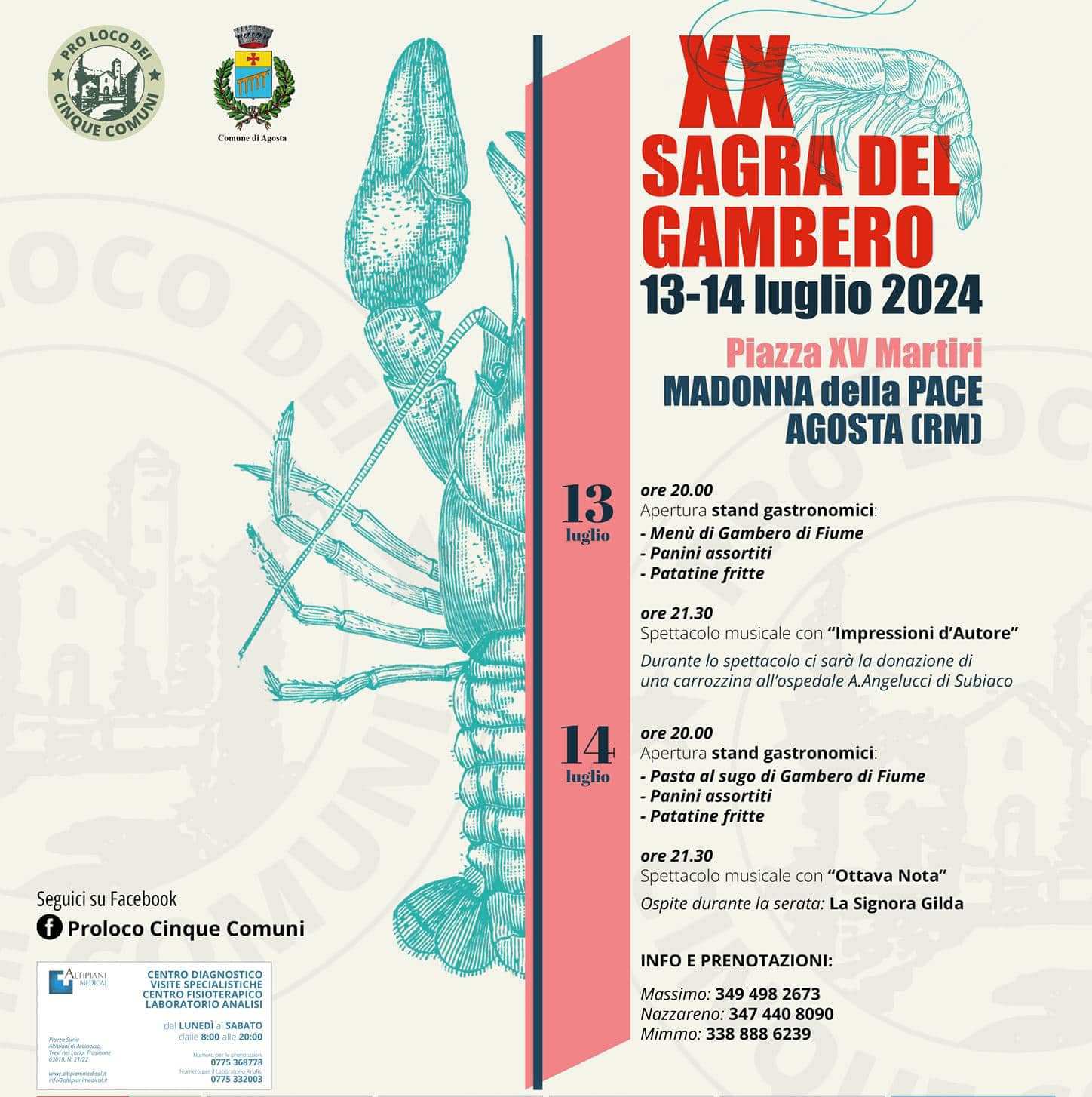 Madonna della Pace – Torna il tradizionale appuntamento con la XX SAGRA DEL GAMBERO DI FIUME a Madonna della Pace (Agosta). Due splendide serate all’insegna del buon cibo e del divertimento.
