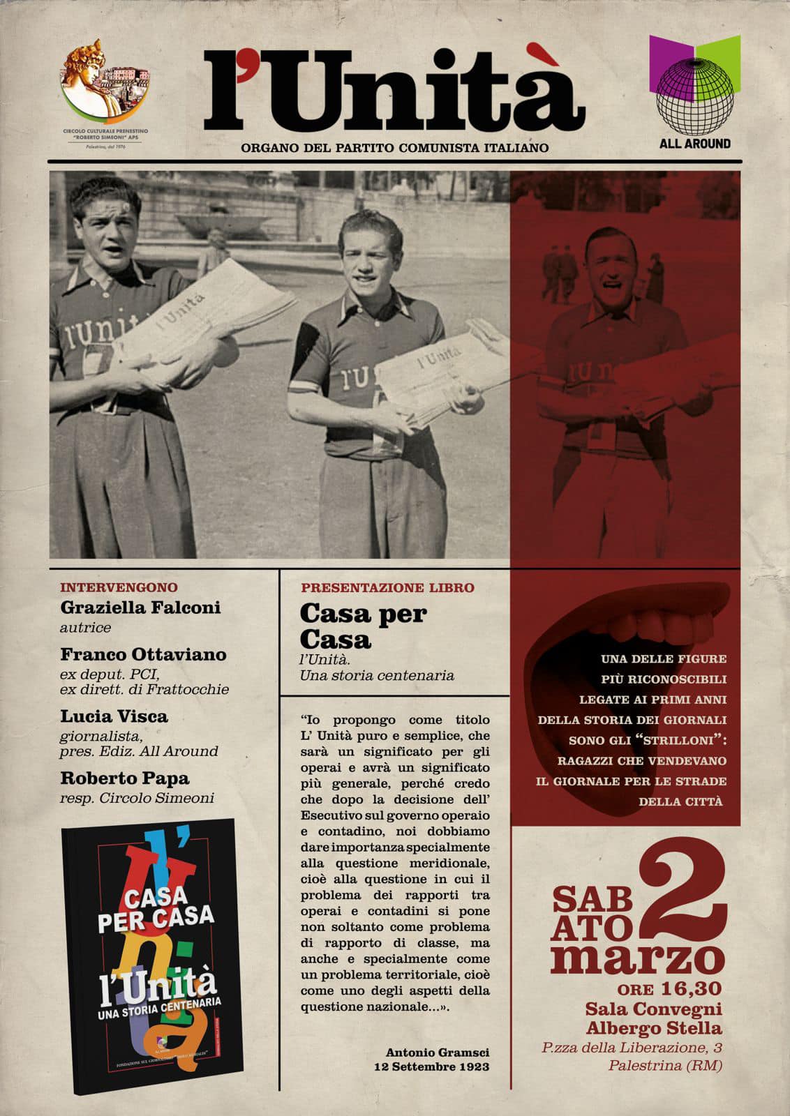 Sabato 2 marzo, ore 16.30, presso la sala convegni dell’Albergo Stella di Palestrina il Circolo Culturale Prenestino Roberto Simeoni Aps presenta il libro di Franca Chiaromonte e Graziella Falconi “Casa per casa. l’Unità una storia centenaria” edito dalla Edizioni All Around.
