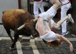 825 metri. Tanto dura la corsa a perdifiato di centinaia di partecipanti, tra spagnoli e turisti, amanti dell’adrenalina, provenienti da ogni parte del mondo. Il percorso inizia dai recinti degli animali, alla base della salita di Santo Domingo, poi si sale verso la Plaza Consistorial per svoltare verso via Mercaderes. È la volta poi della calle Estafeta che conduce per il tratto di Telefonica fino alla strettoia Callejón, che porta alla Plaza de Toros. Gli uomini fuggono dinanzi a sei tori e otto buoi. Animali imponenti che percorrono il tragitto ad una velocità media di 25 Km/h. Per salvarsi la vita bisogna correre più veloce. I tori seguono i buoi e più restano indietro più diventano pericolosi nel loro intento di riunirsi al gruppo.