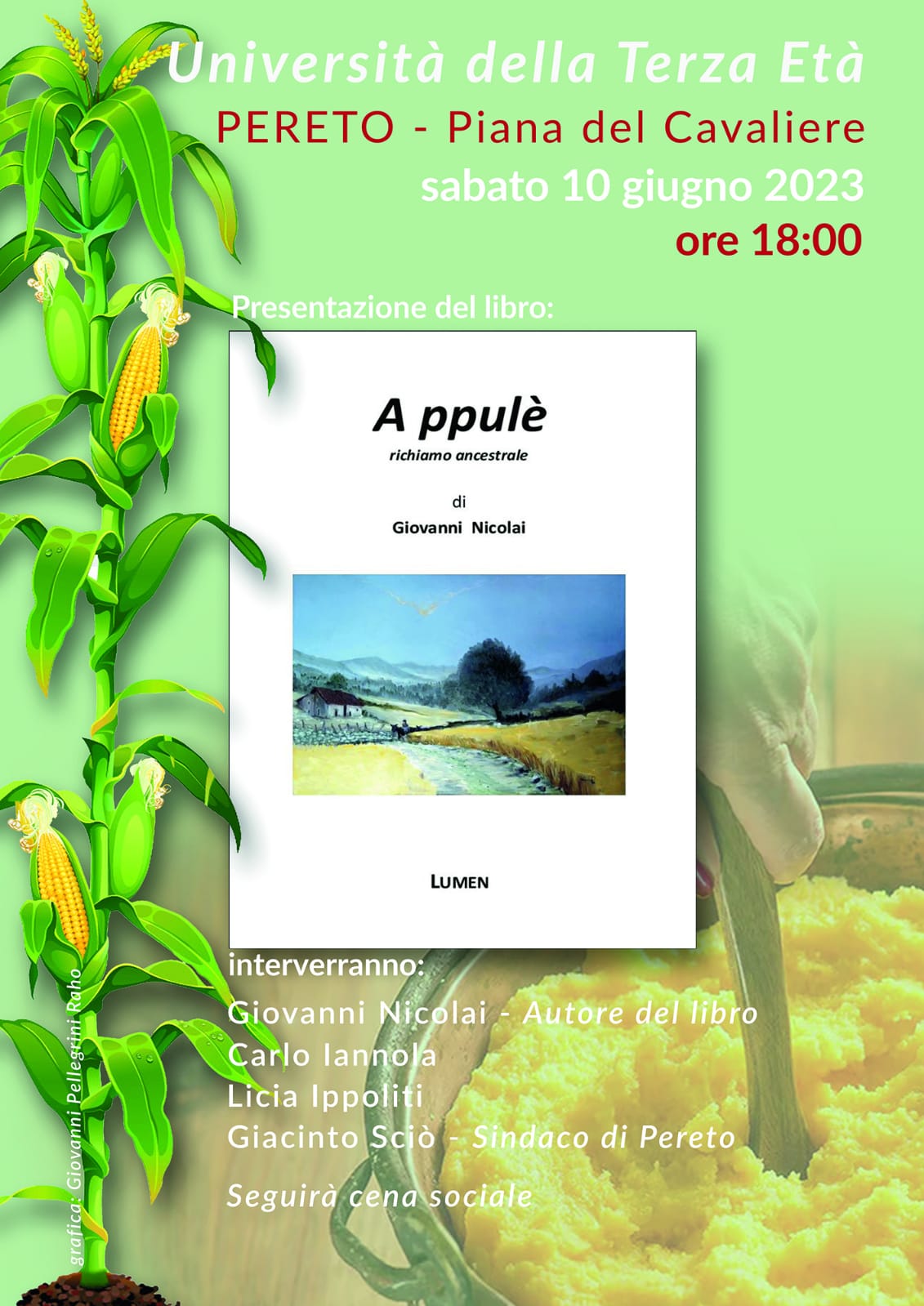 Pereto – Sabato prossimo 10 giugno, alle ore 18, l’Università della Terza Età della Piana del Cavaliere con sede in Pereto, chiuderà le proprie attività con una serata evento: sarà presentato il libro ” A ppule’ ” di Giovanni Nicolai, poeta, narratore, esperto di tradizioni peretane cultore del dialetto locale . Alla manifestazione saranno presenti autorità locali e regionali oltre a rappresentanze di associazioni culturali di tutti i centri del territorio carseolano. Grande importanza riveste la produzione di Nicolai poiché regala al futuro lingua, usanze, personaggi, proverbi, filastrocche, un patrimonio culturale ormai quasi completamente scomparso. @carloiannola