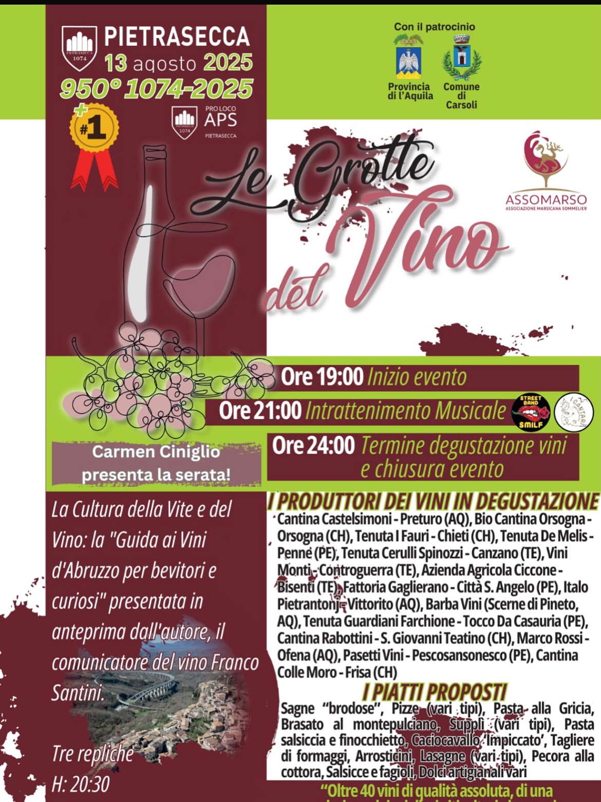 PIETRASECCA – Appuntamento in grande stile nel bellissimo borgo del carseolano che ancora una volta è protagonista di accoglienza e convivialità. Save the date è per il 13 agosto 2025 con un evento patrocinato dalla provincia dell’Aquila e dal Comune di Carsoli: Le grotte del vino, edizione speciale 2025. L’organizzazione curata magistralmente come sempre dalla Pro Loco di Pietrasecca. Di seguito il dettaglio evento: