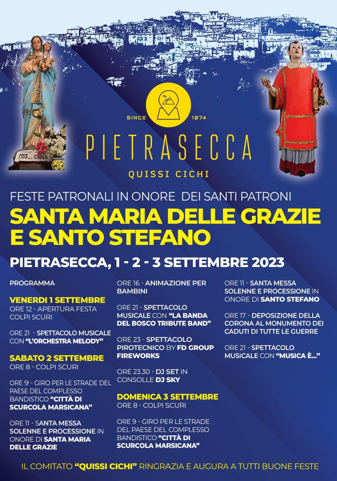 PIETRASECCA – Arriva l’appuntamento con la festa patronale a Pietrasecca: tre giorni da venerdì 1, sabato 2 e domenica 3 settembre 2023. Si celebra Santo Stefano e la Madonna delle Grazie. Diseguito il dettaglio degli eventi: